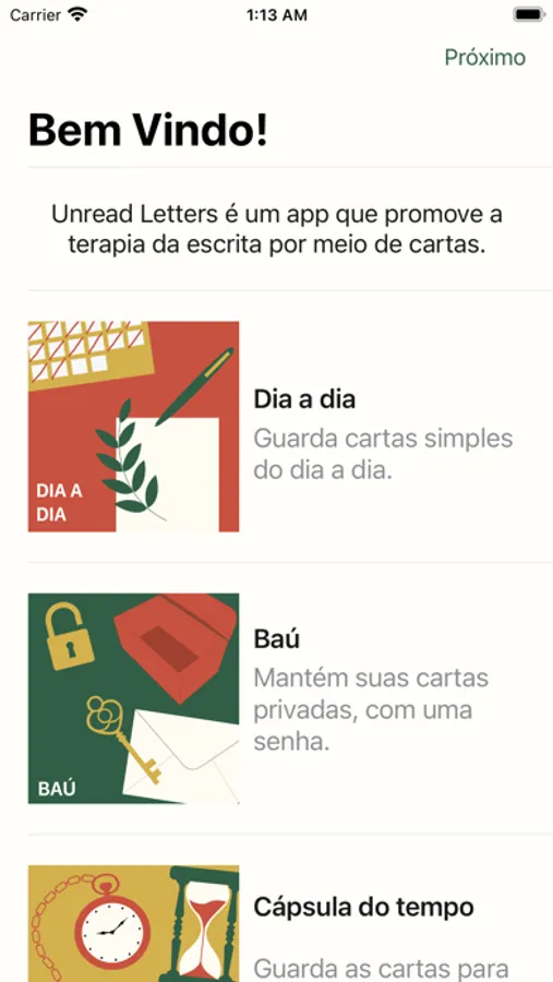 Unread Letters é um app que te dá a oportunidade de escrever cartas contendo títulos, destinatários, datas, também podendo aplicar selos que correspondam aos sentimentos descritos em seu texto. Além disso, você pode manter as cartas em um espaço seguro onde ninguém além de você possa ler e também pode adicionar cartas à coleção "cápsula do tempo", com a intenção de manter as cartas salvas para serem abertas apenas em uma data futura.