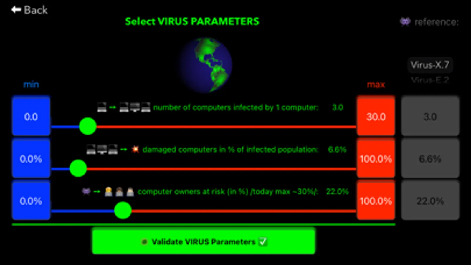 - because the app knows how many people are in each country and in the world, therefore the VirusX expansion will end when the number of infections reaches the maximum population level you set in% (according to actual estimations ~30% of human population has computer with access to Internet).