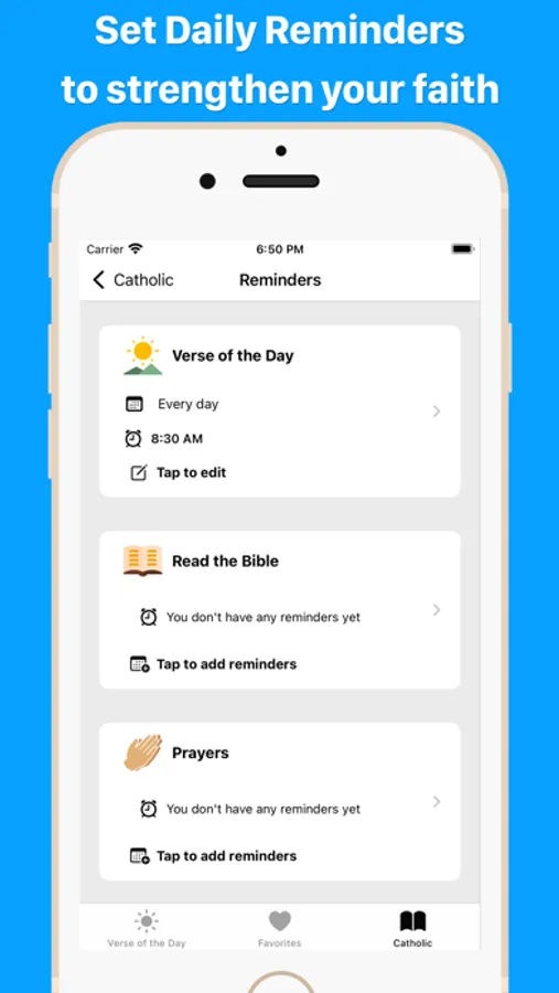 Just choose the time of day, and you will receive an inspirational Bible verse each day on your device.
