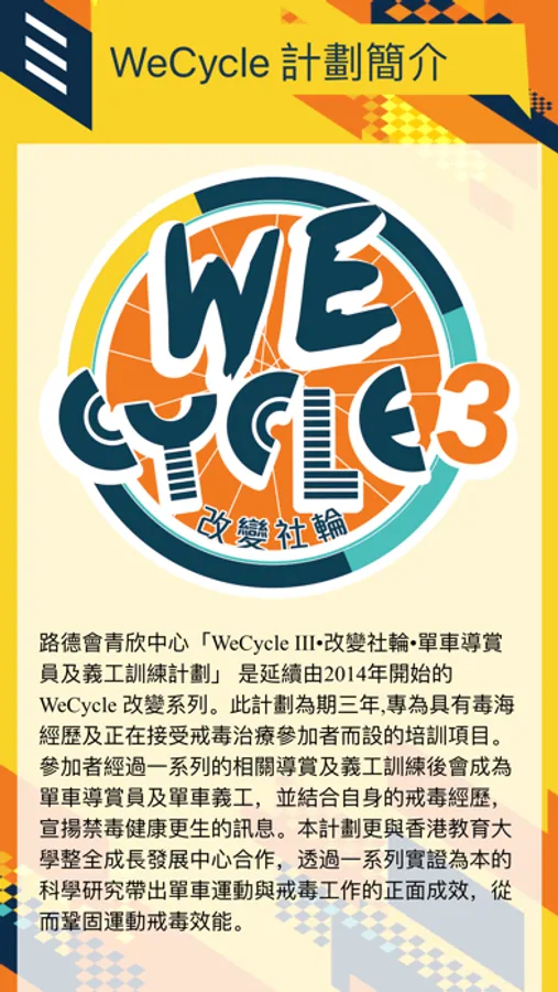 簡介:路德會青欣中心「WeCycle3 • 改變社輪 • 單車導賞員及義工訓練計劃」是延續由2014年開始的「WeCycle改變系列」。此計劃專為具有毒海經歷及正在接受戒毒治療參加者而設的培訓項目。參加者經過一系列的相關導賞及義工訓練後會成為單車導賞員及單車義工,並結合自身的戒毒經歷,宣揚禁毒健康更生的訊息。本計劃由禁毒基金撥款贊助,並由路德會青欣中心聯同香港教育大學整全成長發展中心攜手合作,透過一系列實證為本的科學研究帶出單車運動與戒毒工作的正面成效,從而鞏固運動戒毒效能。