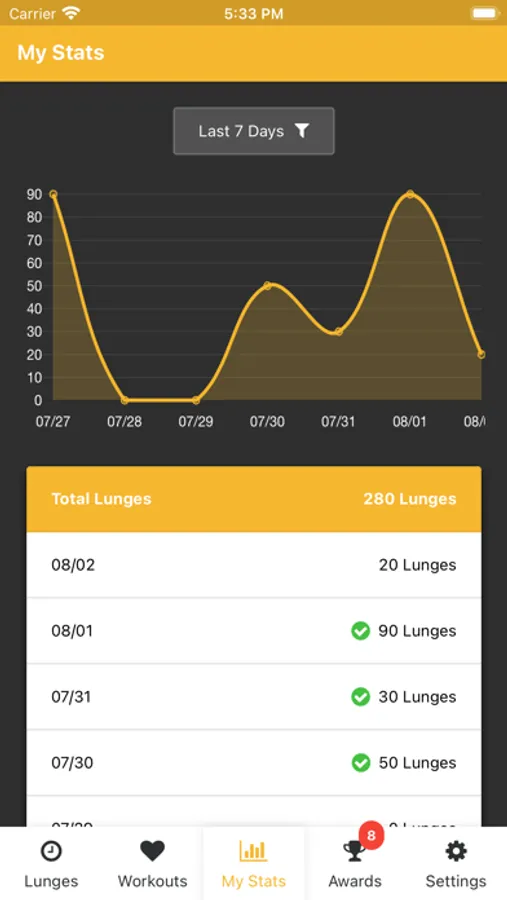 With Lunges Counter you can easily track you lunges throughout the day. View statistics and important information about your lunge tracking. Set daily lunge goals.