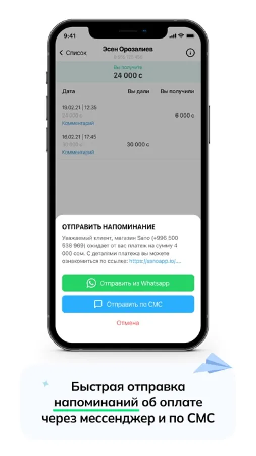 - Легко отправлять напоминания клиентам о предстоящем платеже через мессенджер и по смс