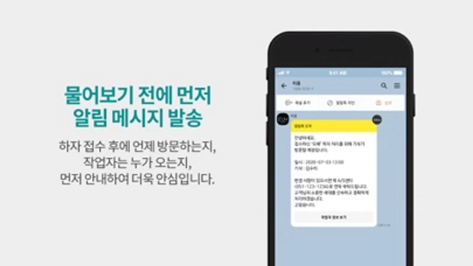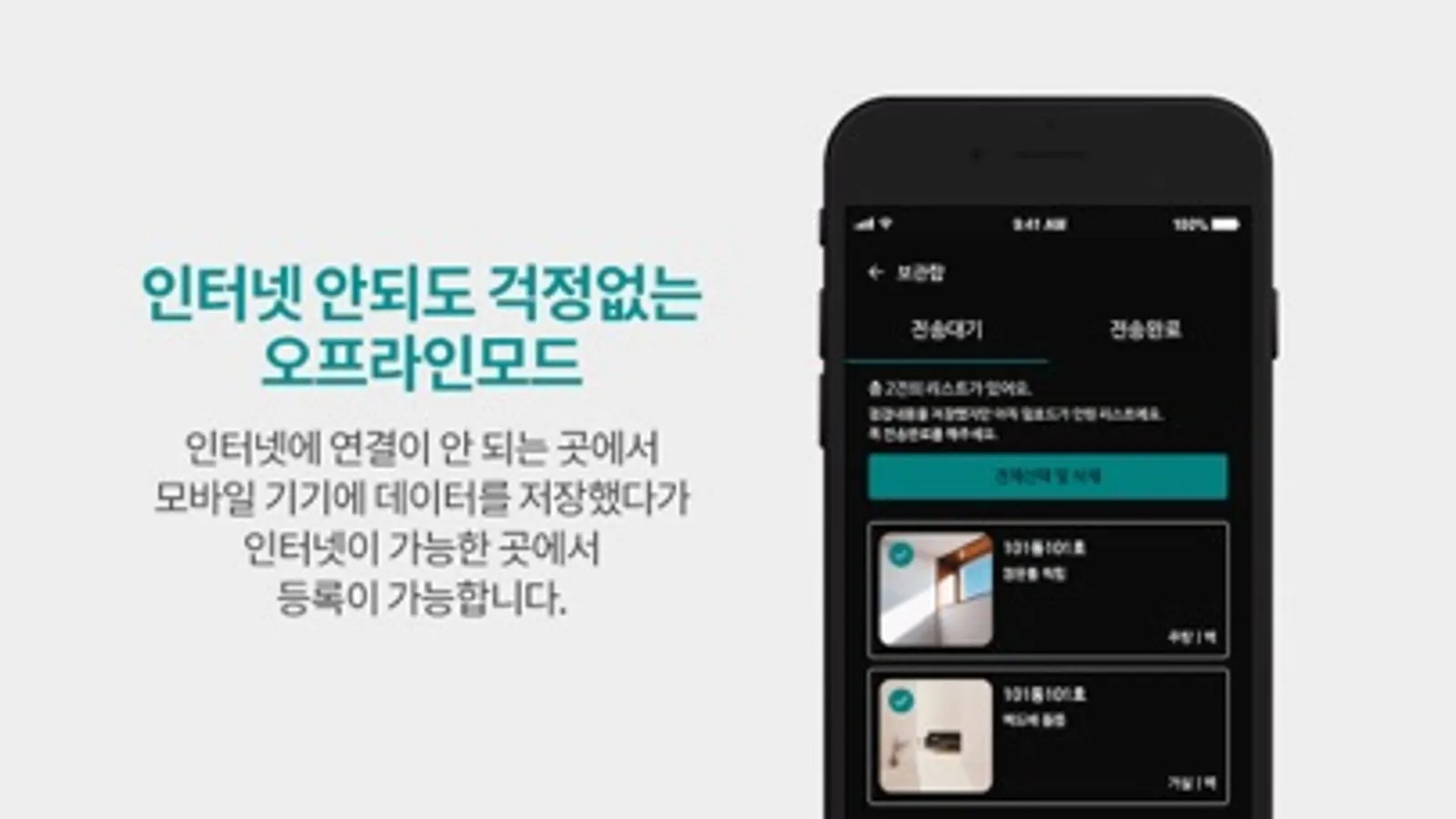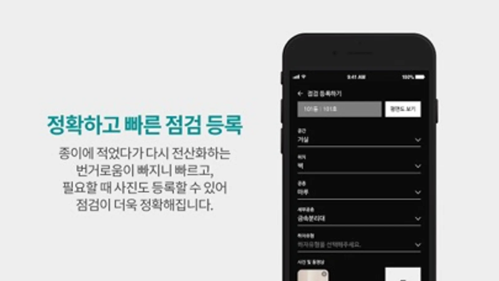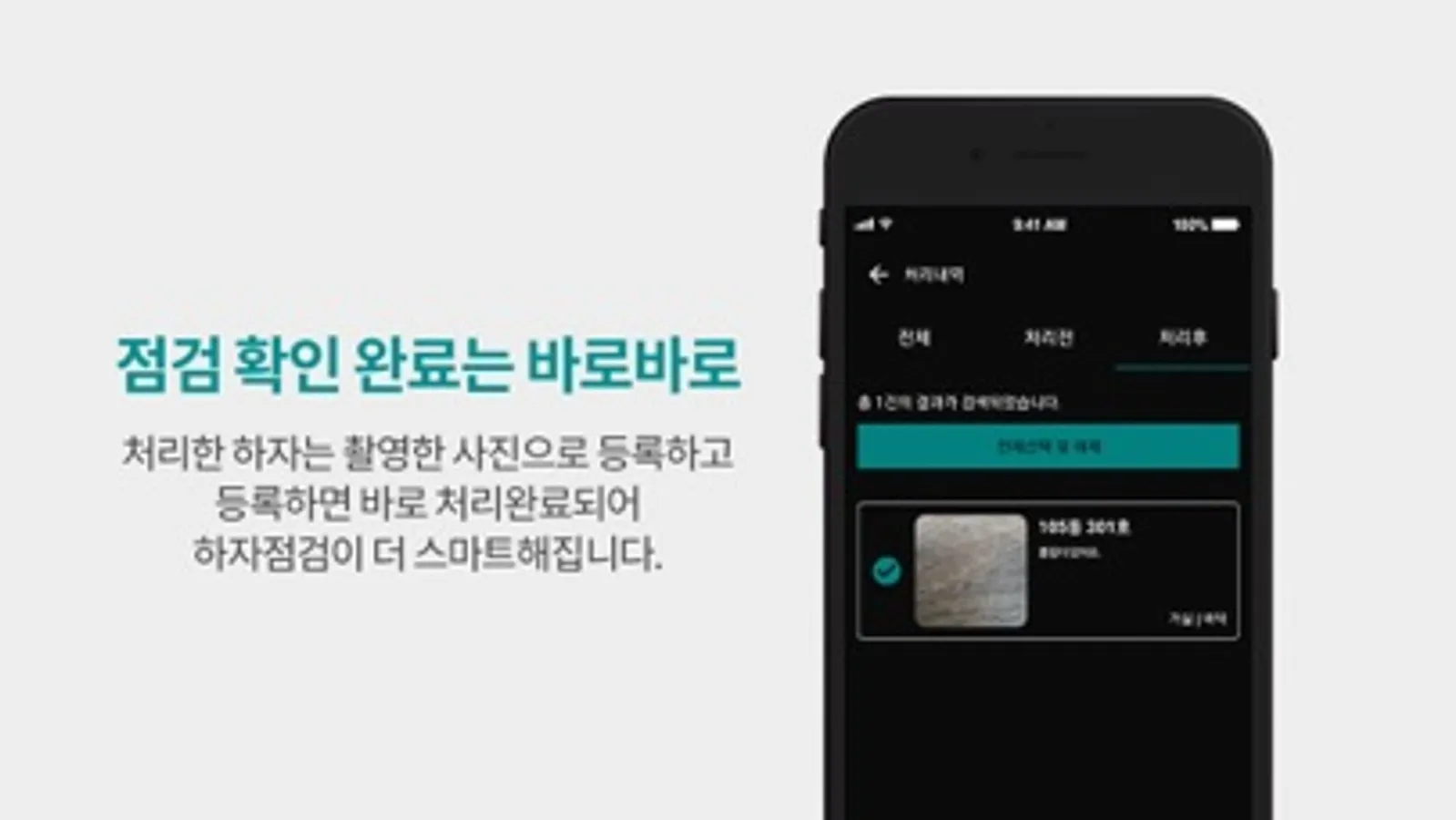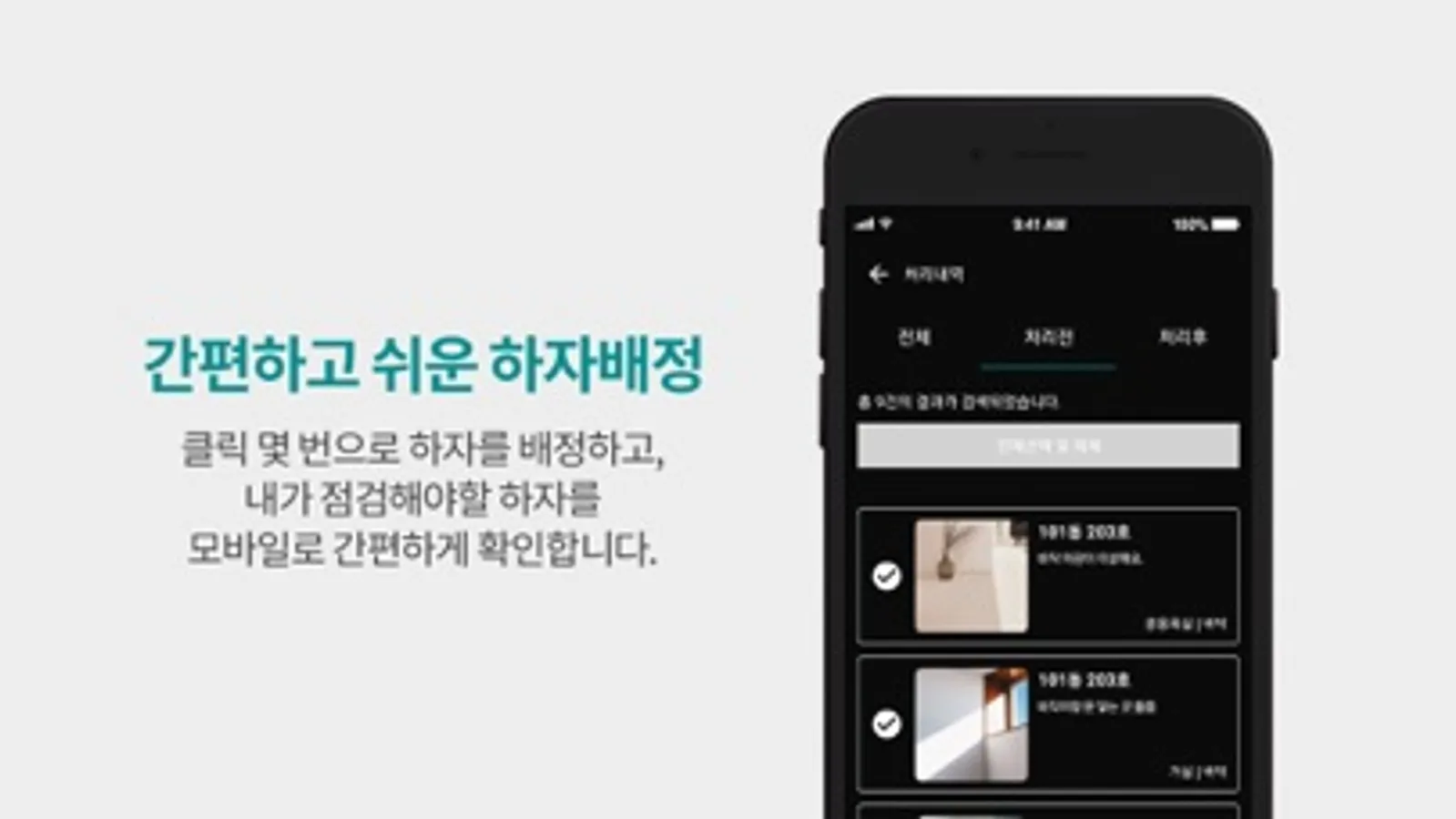 앱으로 배정받은 하자를 확인하고, 처리사항을 사진으로 찍어서 등록하면 실시간으로 점검 완료 처리할 수 있습니다.