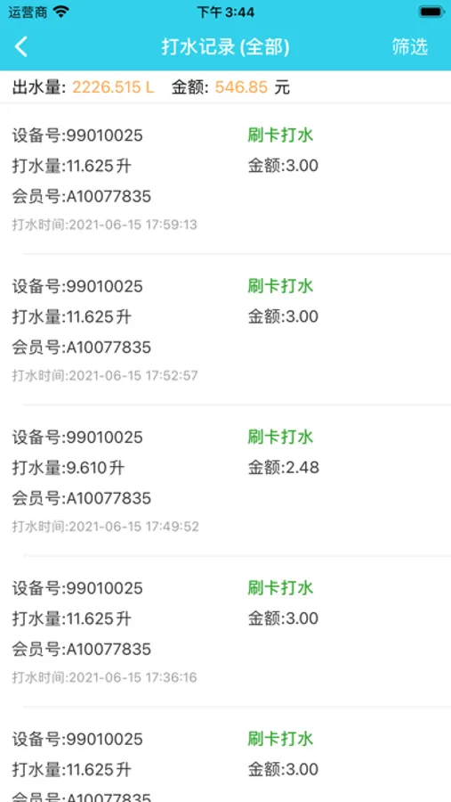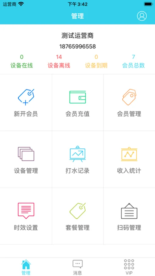 3、收入数据全掌握 充值收入、扫码支付收入、投币收入、打水记录数据等丰富的数据统计功能,让您随时随地掌握经营情况,同时子账号管理功能帮助您充分掌握员工的业绩情况