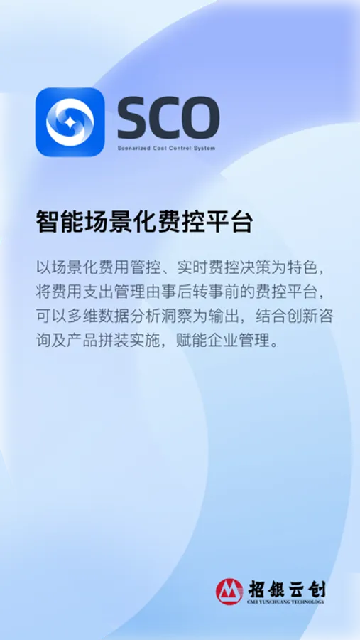 SCO(Scenarized Cost Control system)为招银云创开发的场景化费控平台,即以场景化费用管控、实时费控决策为特色,将费用支出管理由事后转事前的费控平台,可以多维数据分析洞察为输出,结合创新咨询及产品拼装实施,赋能企业管理。