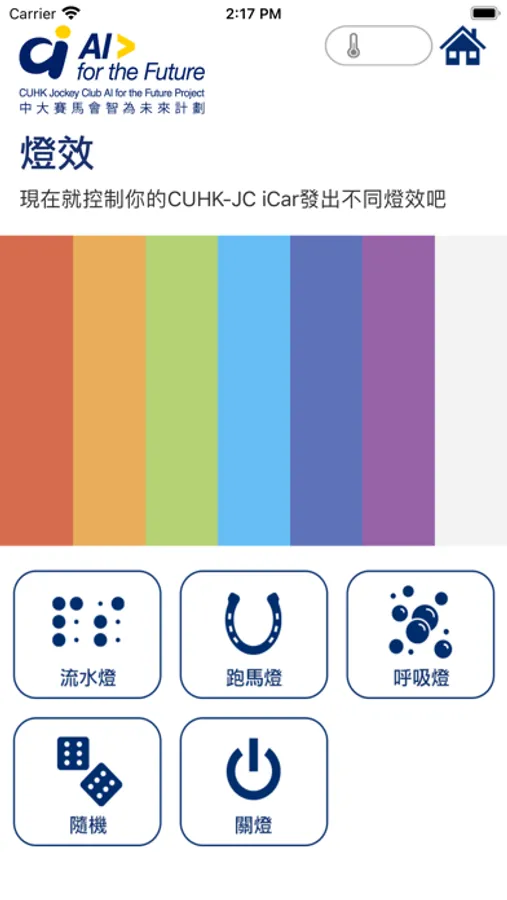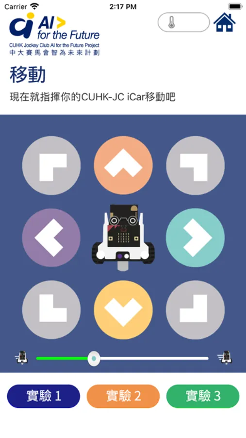 Through this application, users can connect their mobile to CUHK-JC iCar by Bluetooth without programming. The application can control CUHK-JC iCar’s movement, light effect and sound effect through keyboard inside the application. Users can also carry out 3 experiments including obstacle avoiding, object tracking and line tracking through the application.