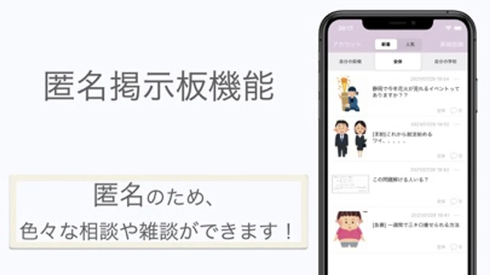 一つ目は匿名掲示板機能。匿名で投稿や会話ができるため、学校のことでも何でも気軽に相談することができます。また「全体」や「学校」ごとに掲示板が分かれているため、よりコアな内容で盛り上がれます。