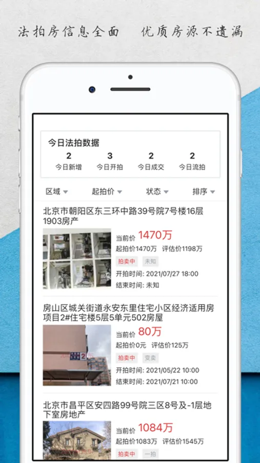 1. 房源全面,囊括淘宝网、京东网、人民法院诉讼资产网、工商银行融e购、北京产权交易所、公拍网及中拍网几大拍卖平台,房源完整不遗漏。
