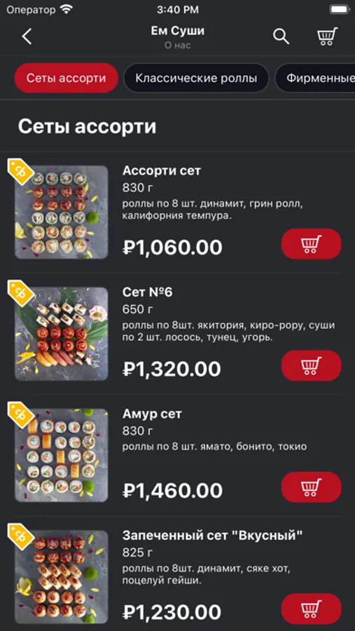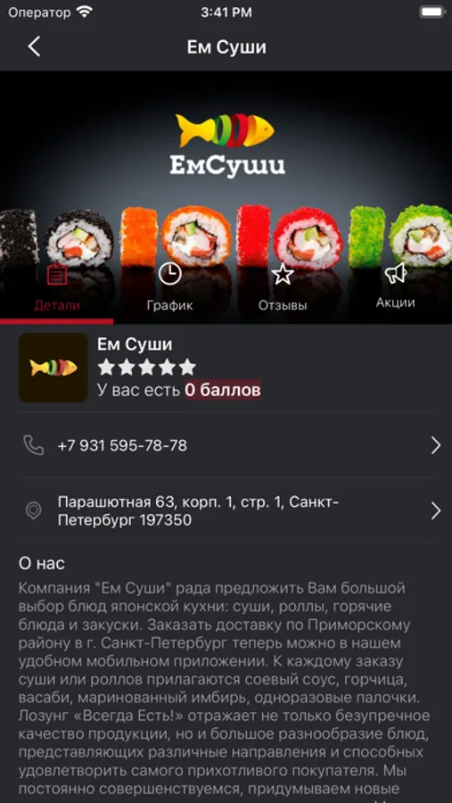 "Компания ""Ем Суши"" рада предложить Вам большой выбор блюд японской кухни: суши, роллы, горячие блюда и закуски. Заказать доставку по Приморскому району в г. Санкт-Петербург теперь можно в нашем удобном мобильном приложении. К каждому заказу суши или роллов прилагаются соевый соус, горчица, васаби, маринованный имбирь, одноразовые палочки. Лозунг «Всегда Есть!» отражает не только безупречное качество продукции, но и большое разнообразие блюд, представляющих различные направления и способных удовлетворить самого прихотливого покупателя. Мы постоянно совершенствуемся, придумываем новые интересные рецепты, расширяем ассортимент. Мы ценим наших клиентов и всегда учитываем их мнение при составлении меню. В приложении действует система накопительного кэш-бэка от 1% до 10% на каждый заказ.