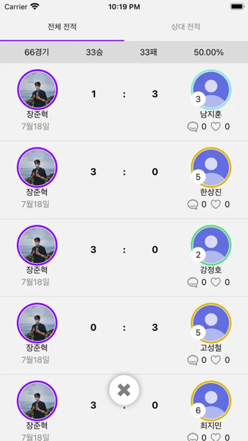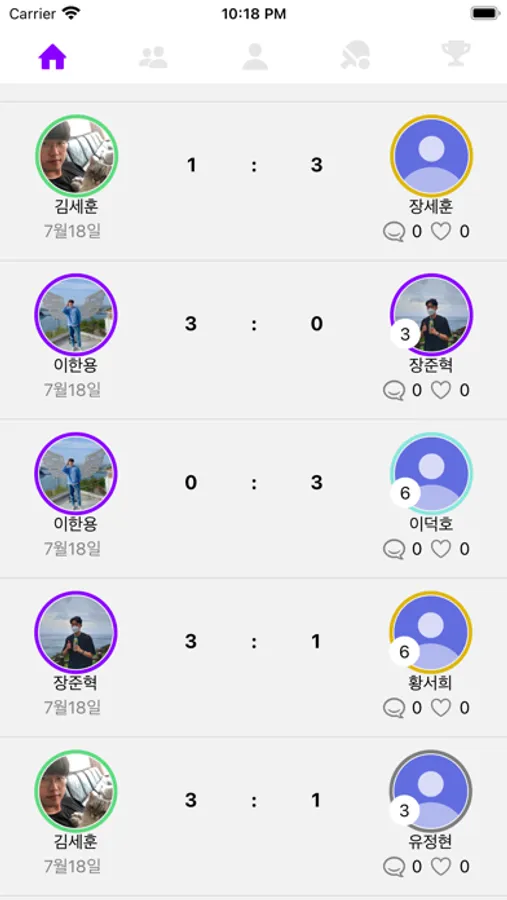 * 또, 친구들을 팔로우하여 내 친구들이 누구와 탁구시합을 했고, 이겼는지 졌는지를 알 수 있는 메인 피드가 있습니다. 내 친구들의 승률과 상대전적을 보는 것도 하나의 재미가 될 수 있습니다.