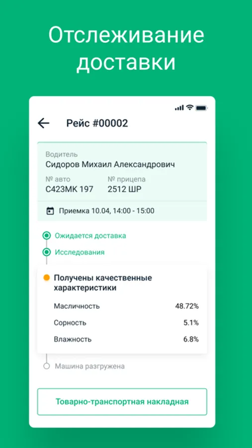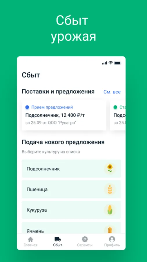 Сервис сбыт сельхозпродукции позволяет заключить сделку с закупщиком полностью в мобильном приложении. Фермер может предложить свою цену поставки, заказать транспорт закупщика, узнать точное время разгрузки для своего транспорта, а также отслеживать выполнение сделки на уровне каждой машины. Обмен и подписание документов происходит в электронном виде.
