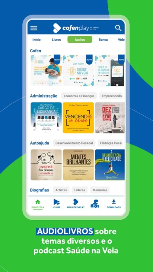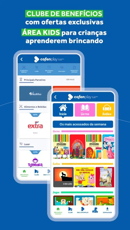 Além de todo esse conteúdo, o Cofenplay oferece um Clube de Benefícios com ofertas e descontos especiais em alimentação, lazer, bem-estar, saúde, produtos e serviços. E área Kids com livros, áudios, atividades para imprimir e jogos educativos para as crianças aprenderem brincando.