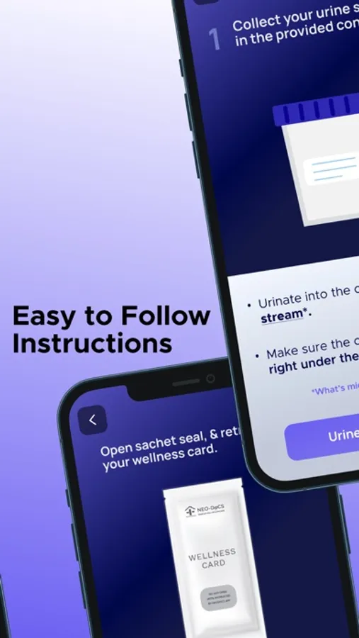1. Simply dip the wellness card into the urine cup provided for 1 second; wait for two minutes, and then scan it using the Neodocs app