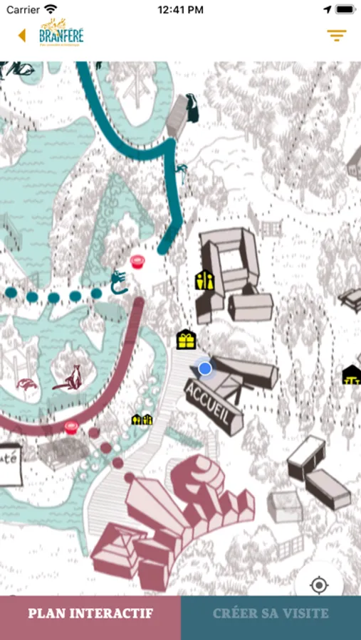 Le plan interactif présente une vue d’ensemble du Parc de Branféré avec les différentes zones et chemins, les animaux, les végétaux, les animations et nourrissages ainsi que les points de restauration et services.