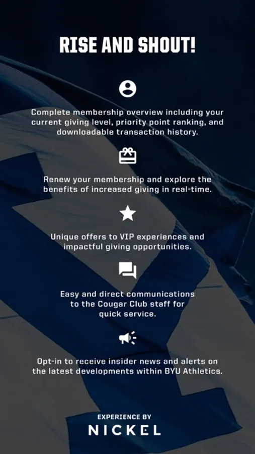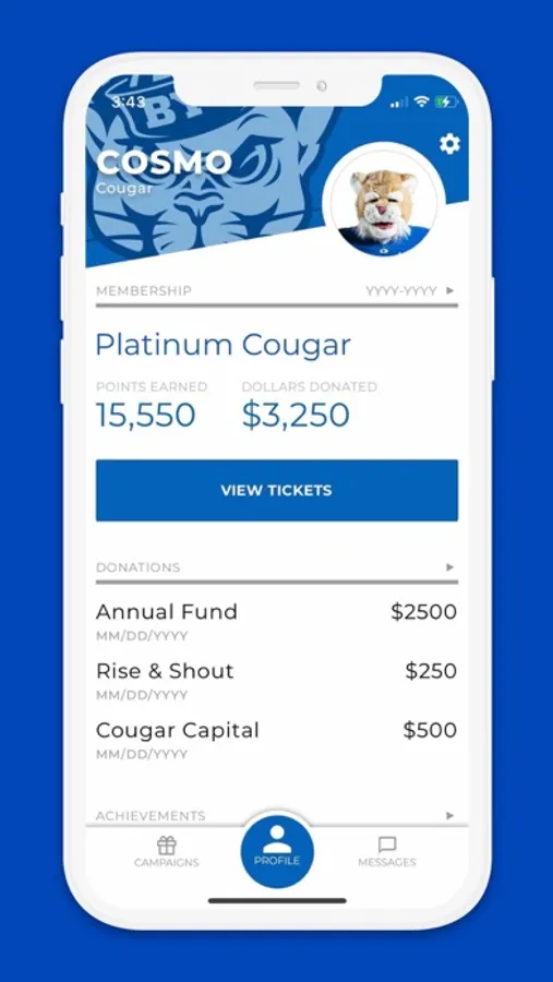Built exclusively for members of the BYU Cougar Club, and specifically designed to improve the donor's experience. Members, can easily manage their membership, receive first-look and exclusive content, and enjoy direct communications with Cougar Club staff from their mobile devices.