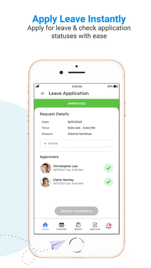• Apply your leave from your smartphone easily and instantly get approval from your superior through the same method.