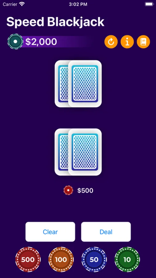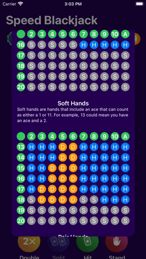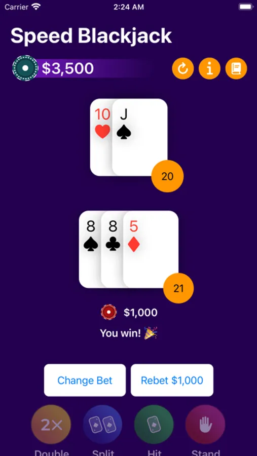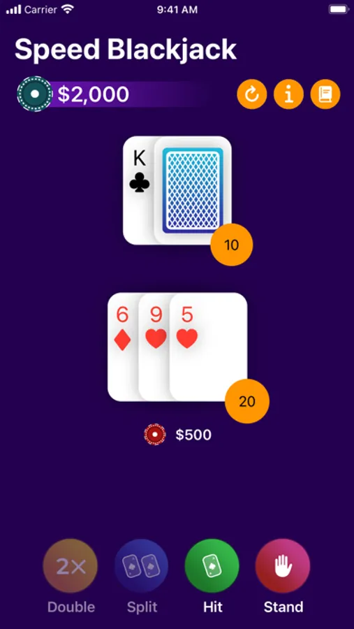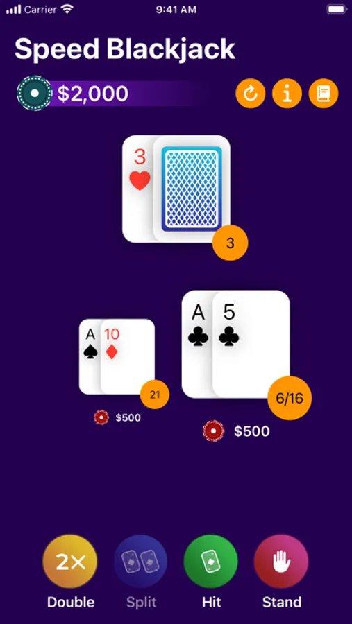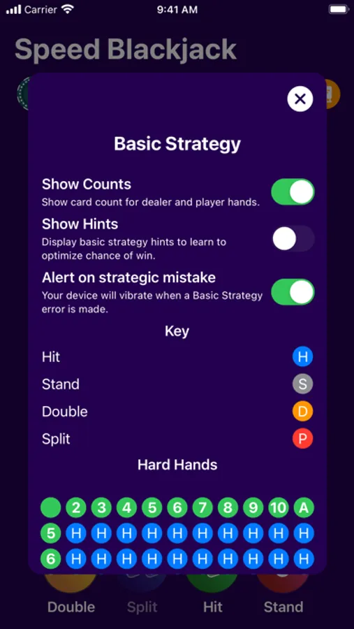 Tap on the Book icon to view Basic Strategy charts and turn on hints. Basic Strategy is the statistically proven method to optimize your chances of winning!