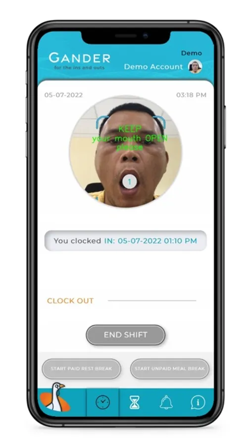 Timekeeping and attendance tool using facial recognition which increases efficiency and productivity in the workplace. Provides a seamless way to clock in and out, to take breaks and eat lunch on a mobile device along with GPS/geofencing feature, together with autonomous reminders via SMS or/and email to ensure employees are taking their breaks.