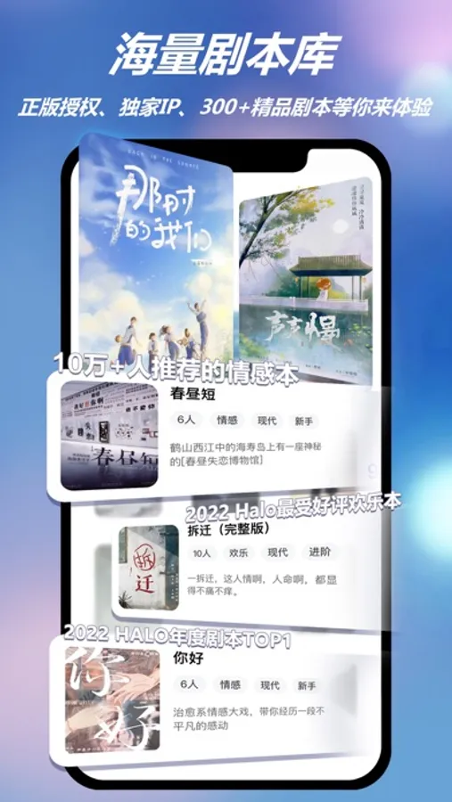 「海量剧本」:城市限定剧本线上首发、线下火爆剧本正版授权,《你好》、《拆迁》、《那一束月光》、《春昼短》等爆款剧本,每月实时更新品质好本,等你来体验。