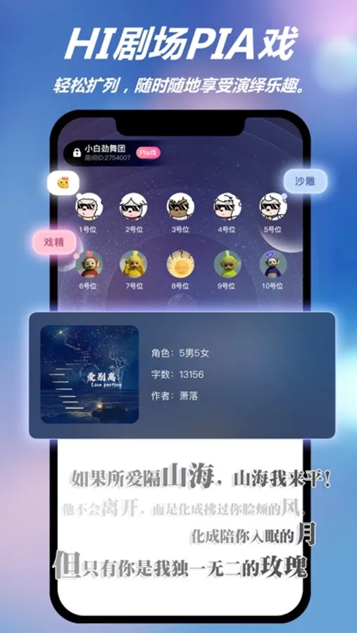摆脱时空和距离的束缚,随时随地一秒入戏,原创独家双人Hi剧场模式,半小时的时间过一把戏瘾,与他/她在平行时空,上演浪漫邂逅。在HALO,每个人都可以自由的展示、扮演自己所期望的形象,在一段段故事中找到真正的自己,用声音表达真我,与其他玩家即时互动,迅速建立友谊的桥梁。
