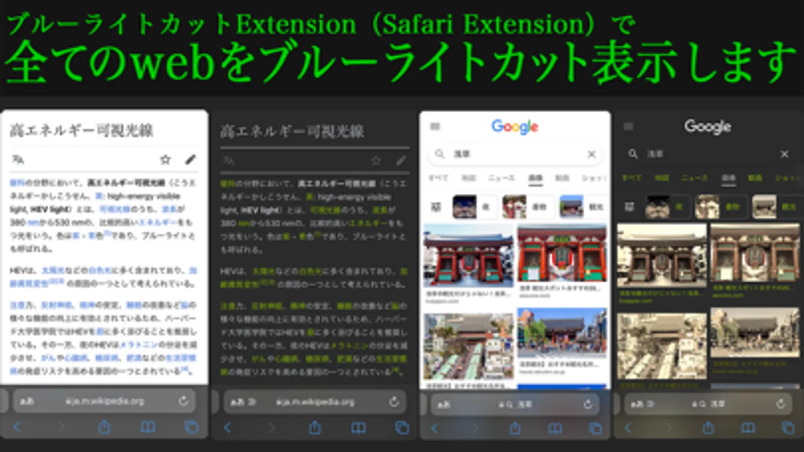 ブルーライトカットExpansion(有償)を有効化することにより、Safariでのweb閲覧時、ダークモードに対応していないwebサイトもダークデザインで表示することができ、画像や写真も眼に優しいセピア調で表示されます。またブルーライトカット表示をすることによりスマホの消費電力も抑えることができます。