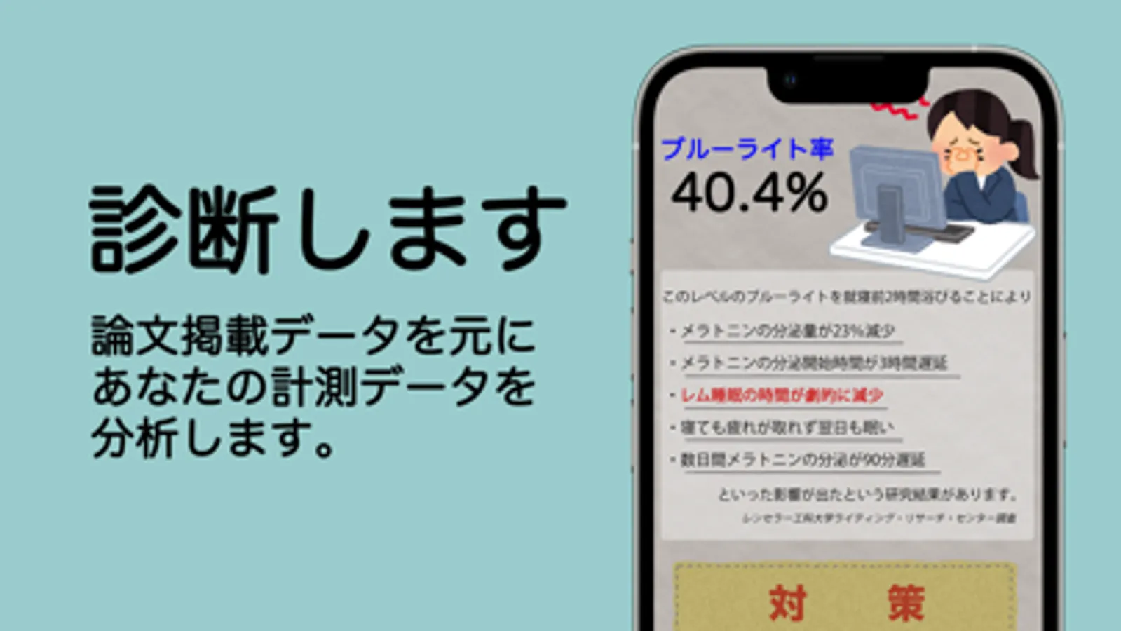 スマホのカメラで撮影するだけで、ブルーライト率を計測し、論文掲載データと比較しスコア化します!