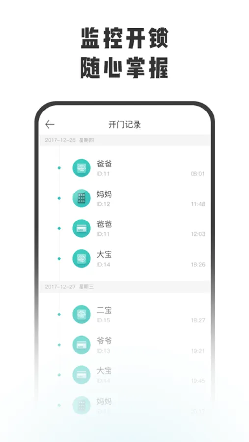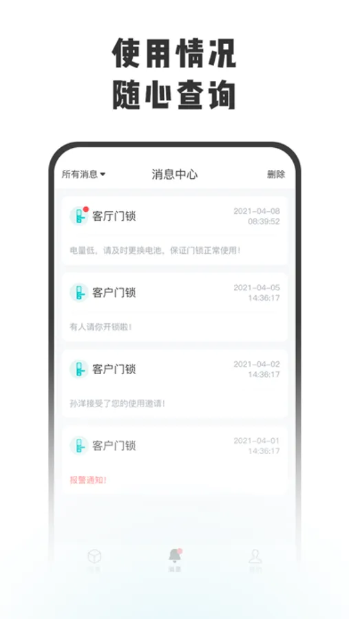 3、远程查看开门报警记录,门锁设置了试错报警,防撬报警等一系列报警监测,保护您的门锁安全,有人在您的门锁上尝试密钥或暴力破坏,您将第一时间收到通知,也可随时随机查看您门锁的使用记录,与您的生活互联。