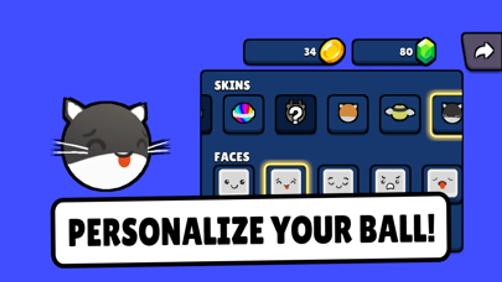 - Unlock exclusive skins and personalize your ball with fantastic costumes, faces, and trails.