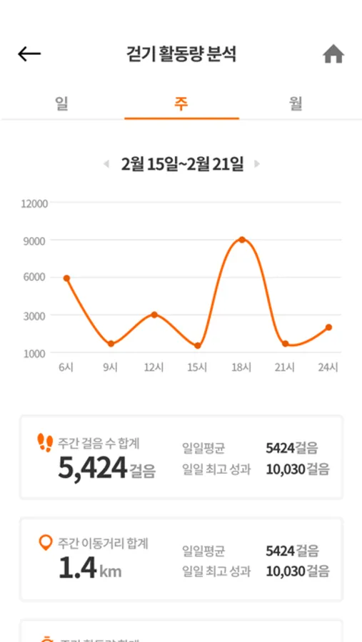 ※ 본 앱은 Healthkit을 통해 측정된 활동량(걸음수, 소모칼로리, 활동거리)을 동기화하고 해당 데이터를 불러옵니다. 측정된 데이터로 그래프를 나타내는 활동량 데이터 통계를 제공합니다.