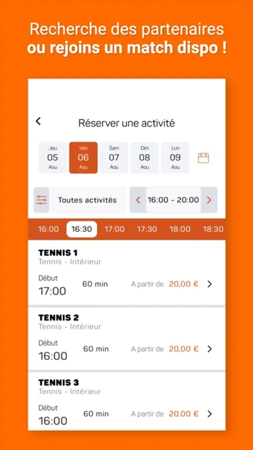 Fini la corvée de réservation ! Avec l'application tu n'as plus qu'à accéder aux créneaux disponibles et à en choisir un. Le club recevra alors automatiquement ta réservation.