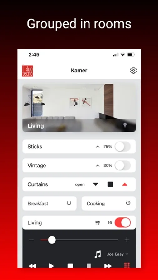 This app allows you to connect to a Duotecno IP master and control your home. You can read the initial configuration just by scanning a QR code and customise it further on your phone. You can change moods, alarms and events.