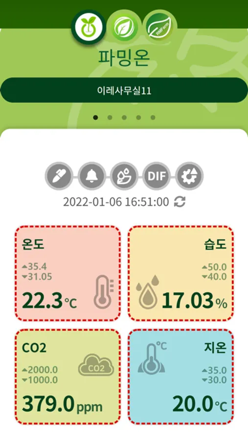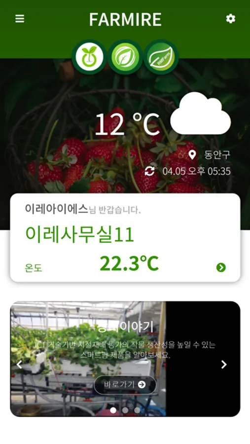 이레아이에스에서 개발한 파밍온, 파밍온2, 알엠팜 장비를 통해 외부 측정 정보 및 근권부 측정 정보를 모니터링 할 수 있는 어플리케이션이다.