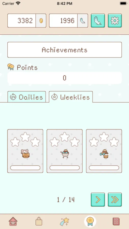 ACHIEVEMENTS: Complete daily and weekly achievements for rewards. Use rewards to unlock more content and buy fancier cat items!