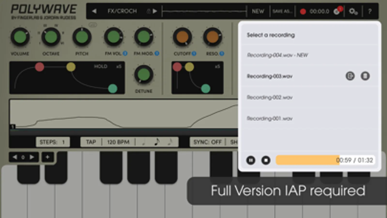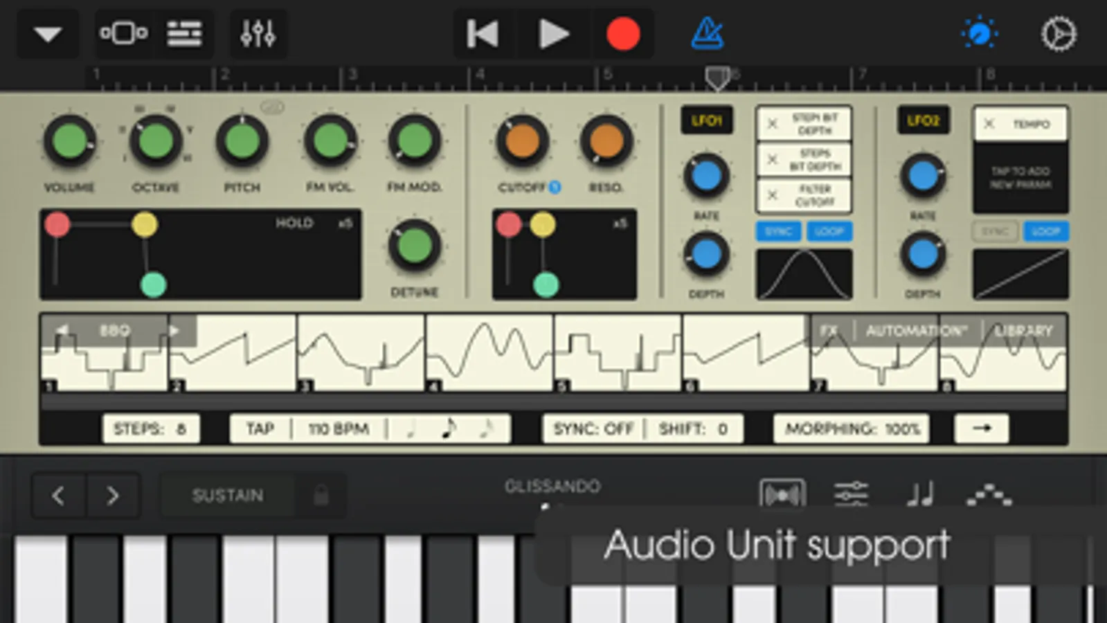 PolyWave can be connected to your favorite keyboard with MIDI, and also functions as an audio unit that can be loaded onto any other DAW. Our built-in live recording module allows you to record your creations right on the app.