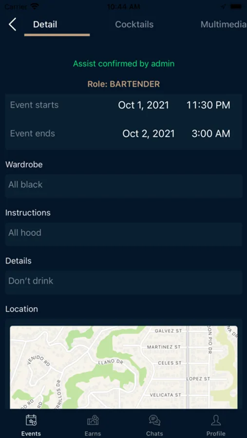 √ Details of the event with a map and how to get there, a list of cocktails to be prepared and a small social network to share photos and videos of the event.