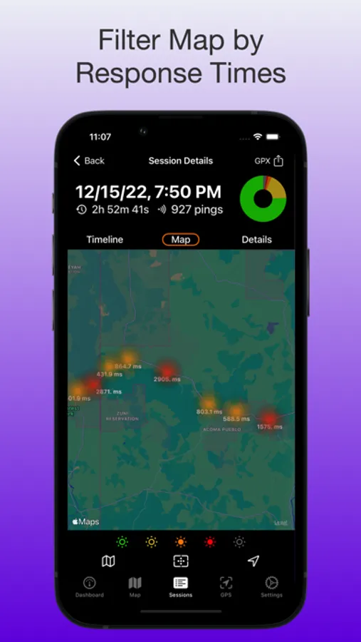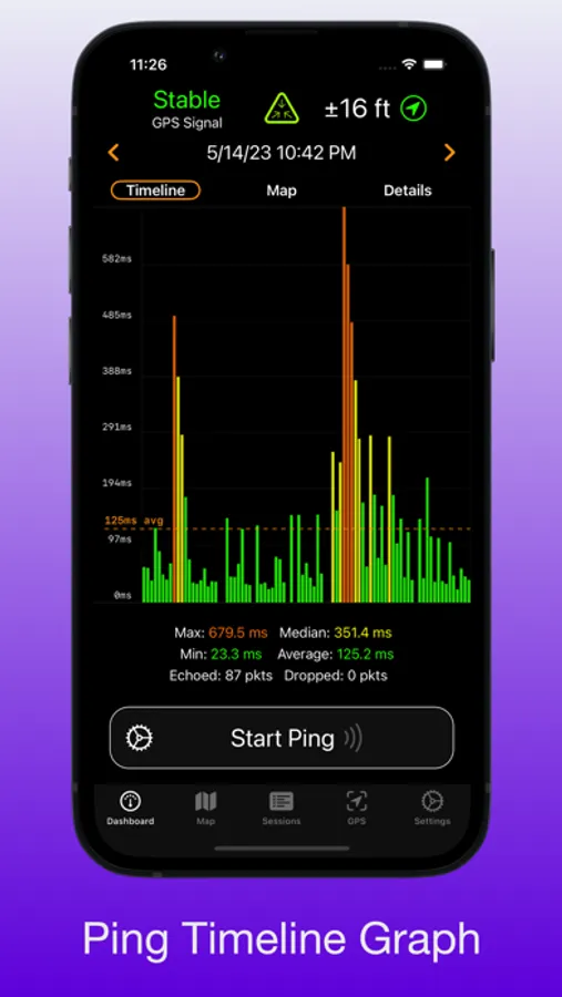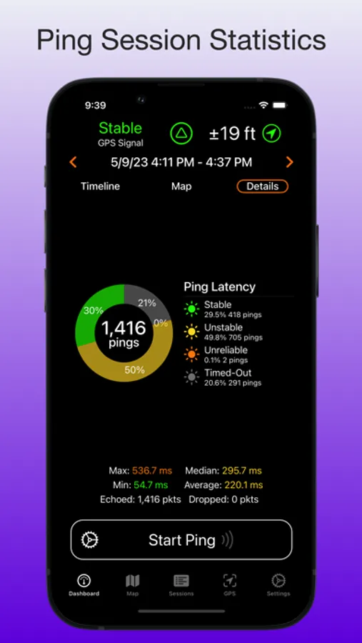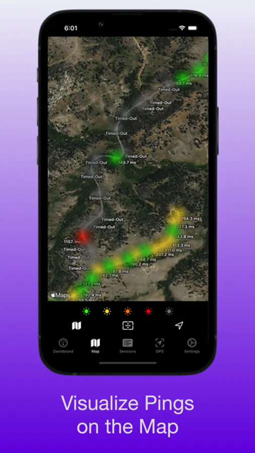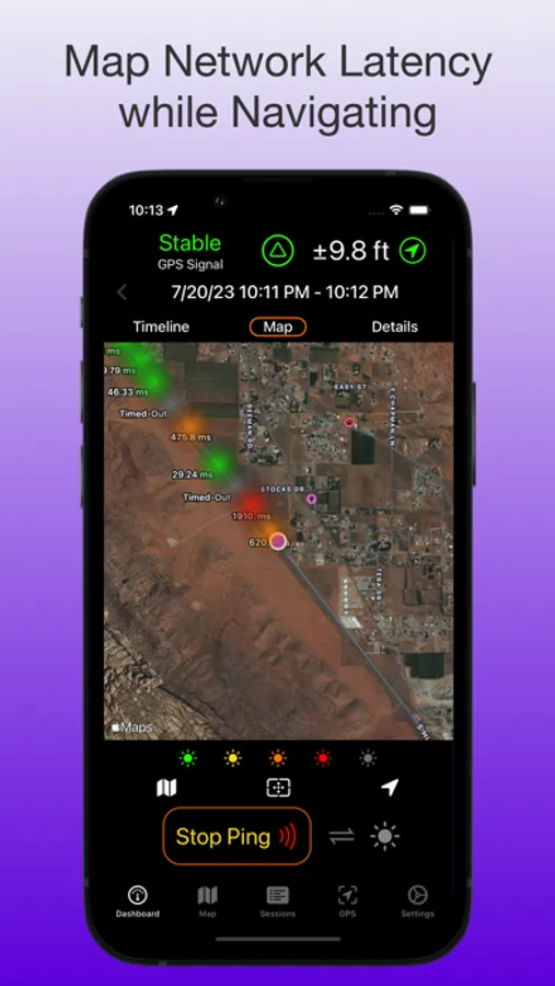 Visualize network ping latency on a map to find the best signal in your area. Record a ping session while navigating to map the connectivity of an area, route, or trail. Pings are recorded on the map as different colored blips ranging from green to red, indicating good to poor latency. Select different ping intervals or target hosts for your tests.