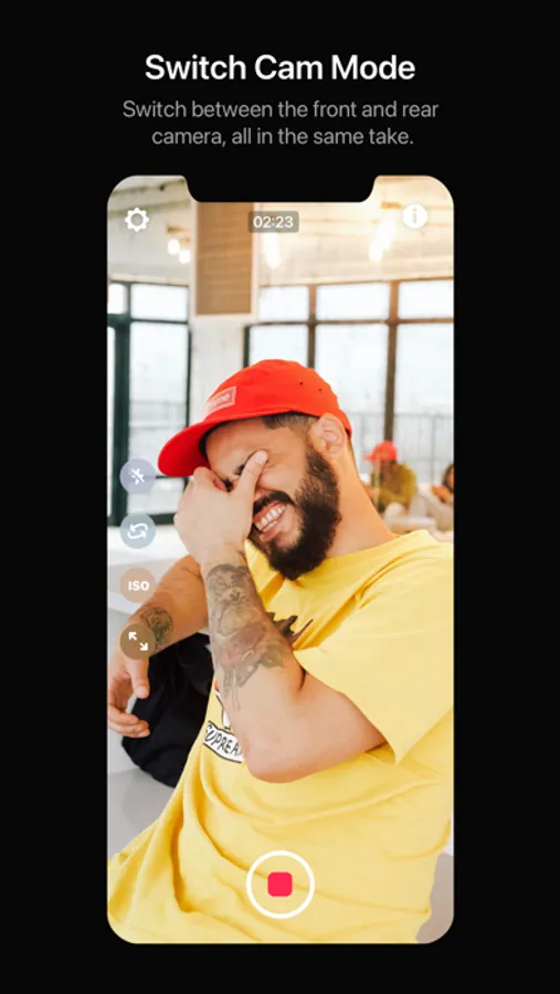 • Switch Cam Mode - Seamlessly switch between the front and rear camera while recording the one take.