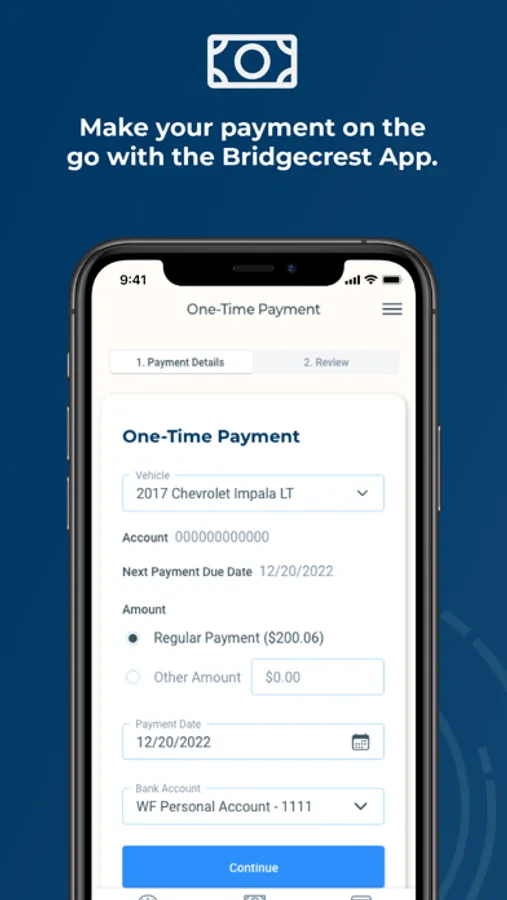 You can manage your vehicle account settings, update your contact information, view your saved payment account details, and review a variety of payment options so you can find what works best for you. If you have more than one vehicle account with Bridgecrest, you can manage them all within our app.