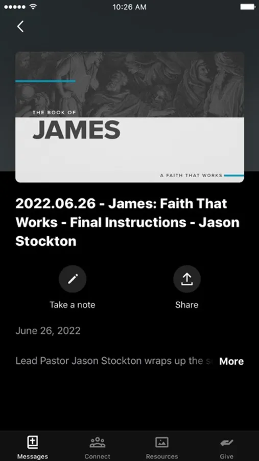 This app will help you stay connected with the day-to-day life of Life Church. With this app you can: watch or listen to past messages; stay up to date with push notifications; share your favorite messages via Twitter, Facebook, or email; and download messages for offline listening.
