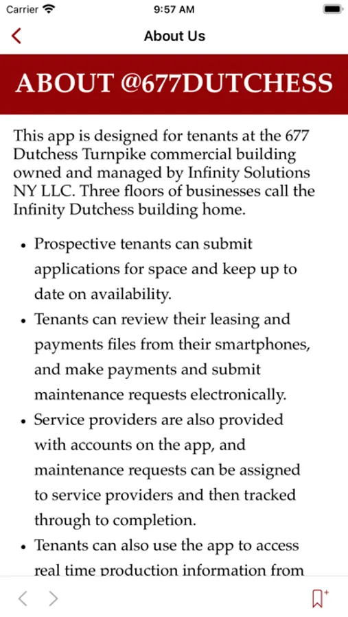 This app is designed for tenants at the 677 Dutchess Turnpike commercial building owned and managed by Infinity Solutions NY LLC. Prospective tenants can submit applications for space and keep up to date on availability. Tenants can review their leasing and payments files from their smartphones, and make payments and submit maintenance requests electronically. Service providers are also provided with accounts on the app, and maintenance requests can be assigned to service providers and then tracked through to completion. Tenants can also use the app to access real time production information from the solar power system that powers the building, as well as other available information and notices about the building. Emergency and routine communication for tenants can also be initiated through the app.