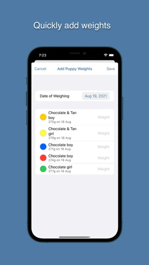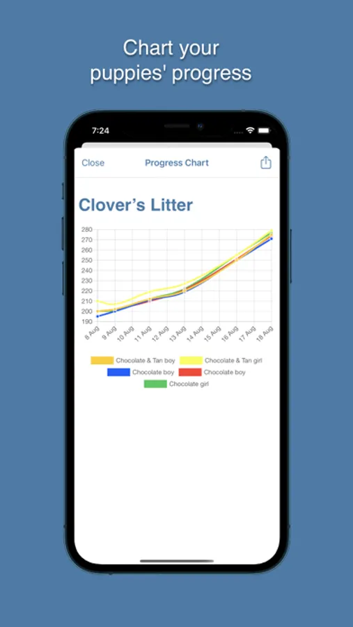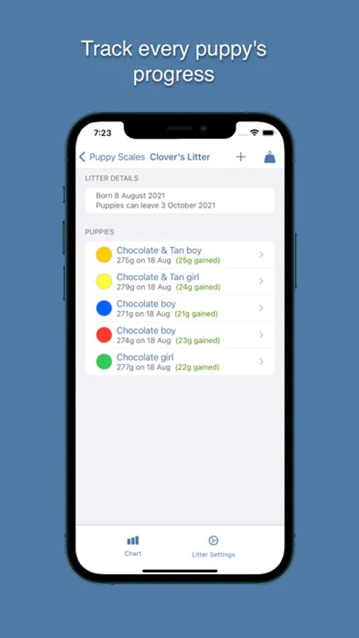 In addition to storing weights the app generates a progress graph do you can compare the growth of each pup in the litter.