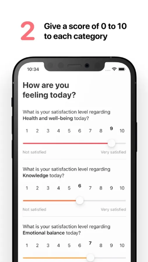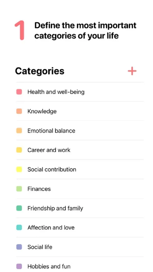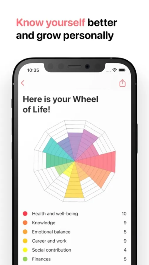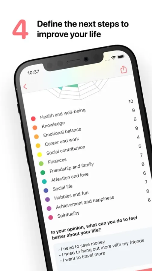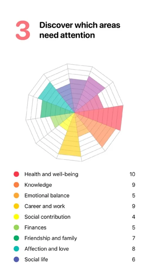 With our app, you can define the categories that matter most to you and answer the quiz to assess your level of satisfaction in each of these areas. The intuitive and illustrative graph helps you visualize the areas of your life that are in balance and those that need more care.