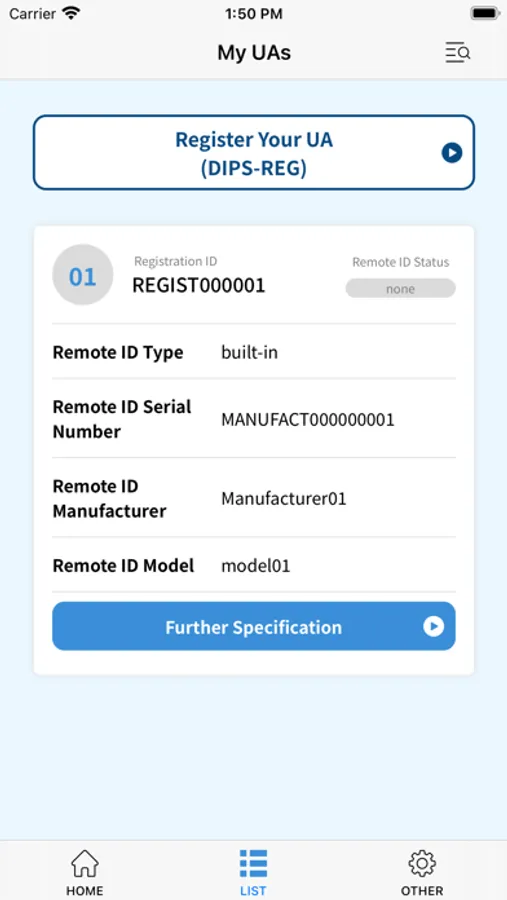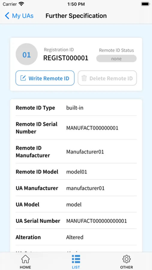 With the mandatory registration of UA, in addition to the physical Registration ID displayed on the aircraft, the aircraft must be equipped with a remote ID function that remotely transmits ID information via radio waves. Use this app to write the registered ID information to a remote ID product or the like. Check the MLIT website for details on the remote ID feature and exemptions.