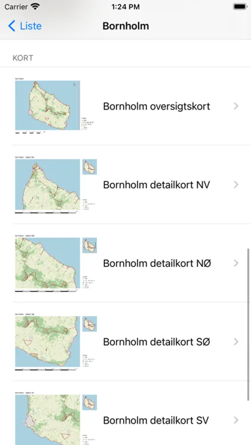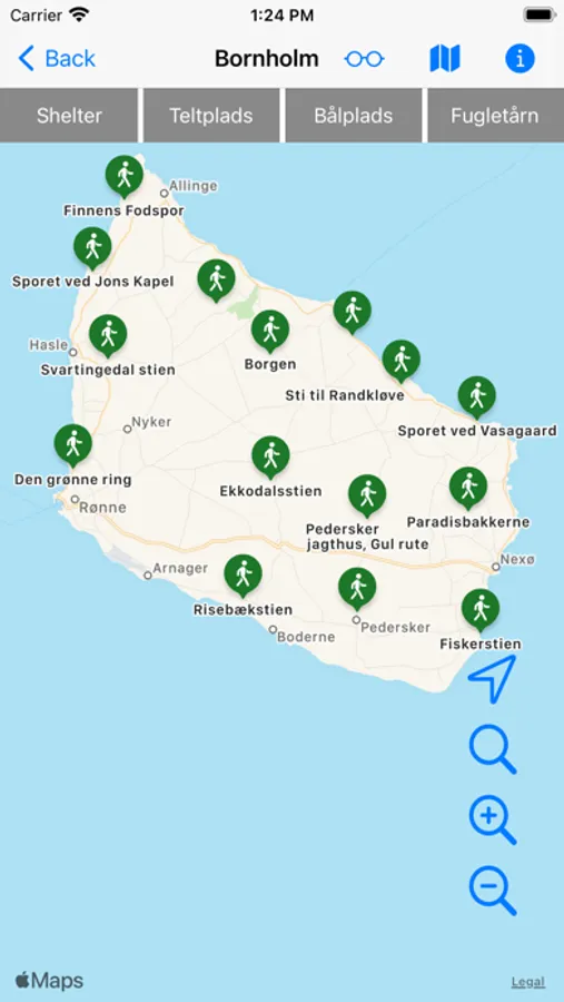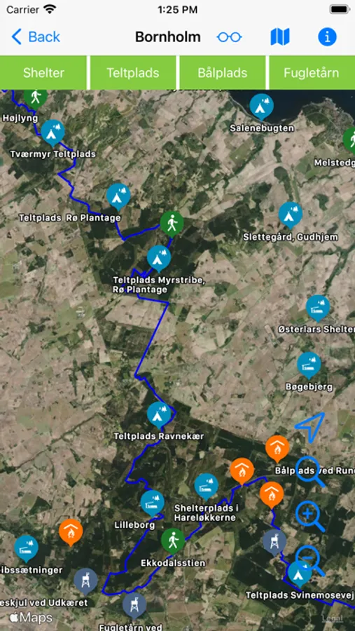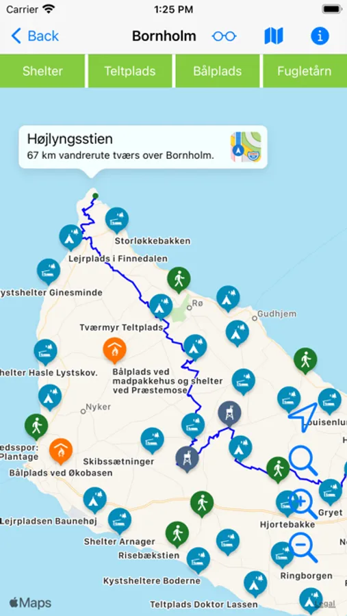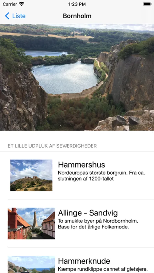 Appen indeholder herudover en side med inspiration til udflugter samt detaljerede kort i pdf-format der kan udprintes.