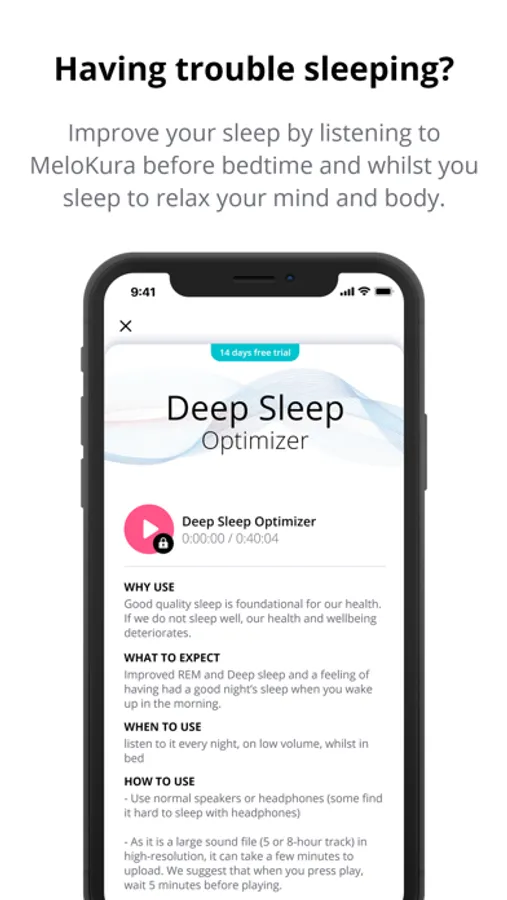 Never listen to the melocura pre-sleep or deep sleep sound streams whilst driving, operating machinery or equipment, or undertaking any potentially hazardous activity.