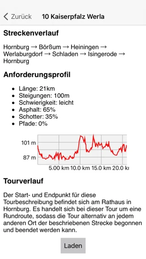 Zu den Touren können eine ausführliche Beschreibung mit vielen Informationen wie Länge, Höhenmeter, Schwierigkeitsgrad und der Routenverlauf mit Hinweisen zu den POIs (interessante Orte) aufgerufen werden. Zu jedem POI gibt es Tipps und Empfehlungen. Ist eine passende Tour gefunden, so kann diese aufgerufen werden und der Startpunkt erscheint sofort in der Karte. Ihre aktuelle Position wird ständig angezeigt und nachgeführt.