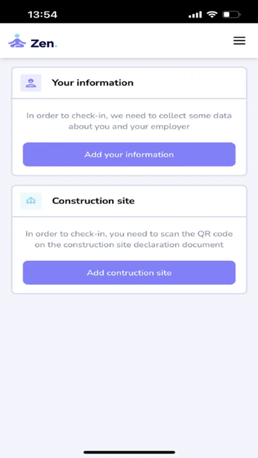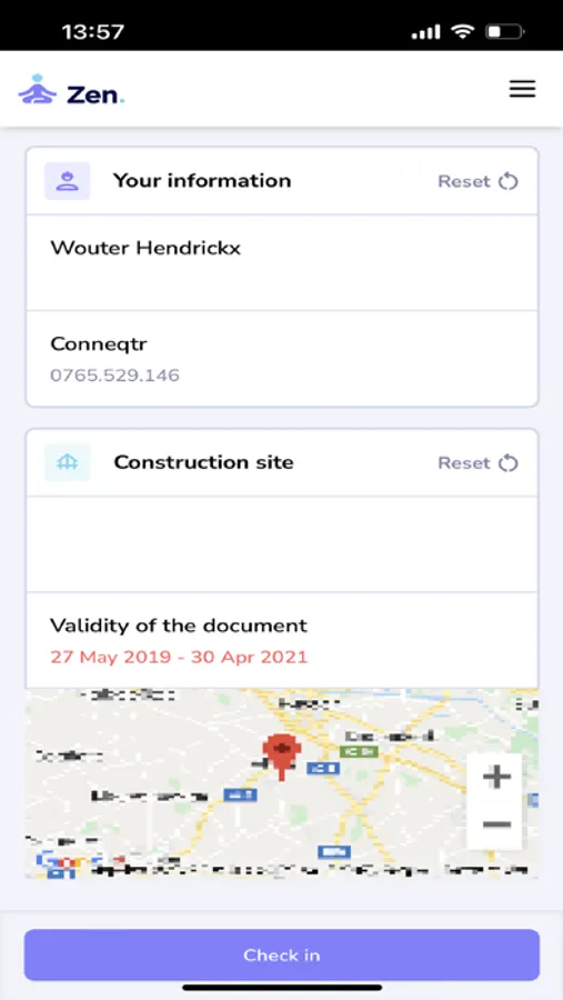Conneqtr Zen Mobile enables construction site workers to perform check-ins for the Checkin-At-Work Belgian government platform through the Conneqtr Zen data platform.