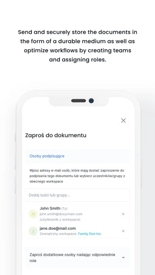 With DoxyChain, you can send and securely store the documents in the form of a durable medium as well as optimize workflows by creating teams and assigning roles. By cooperating on a contract with a B2B / B2C client or your team, you will save time and minimize costs, simultaneously reducing paper consumption.
