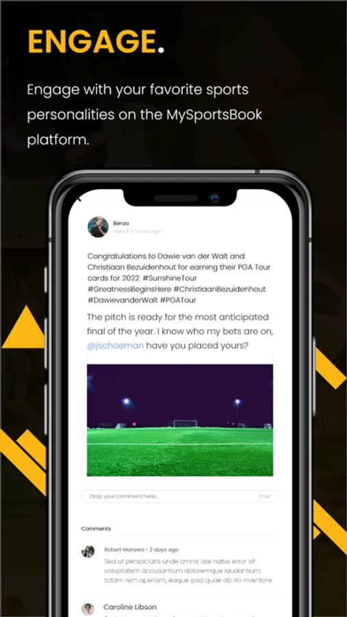 Connect, Network and Engage with other sports fans and confederations from around the world, featuring the likes of Happy Jele, Dino Ndlovu, Rhulani Mokwena, Tennis South Africa, Sunshine Tour, GolfRSA, Golf PGA, Swimming South Africa, Netball South Africa, and more exclusive to MySportsBook.