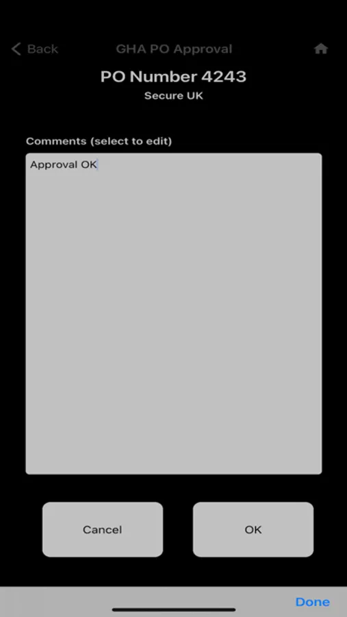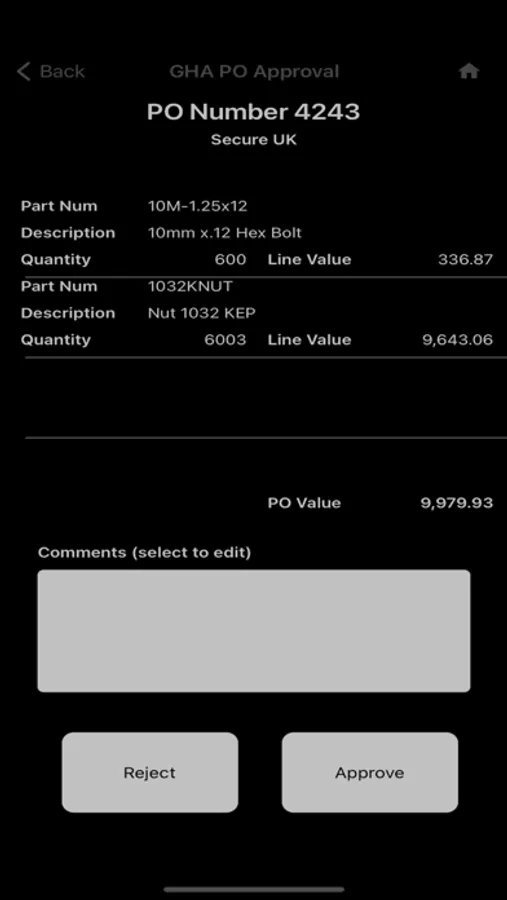 View the PO details, including misc charges, add comments and approve or reject the PO.